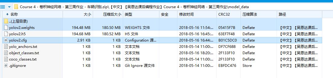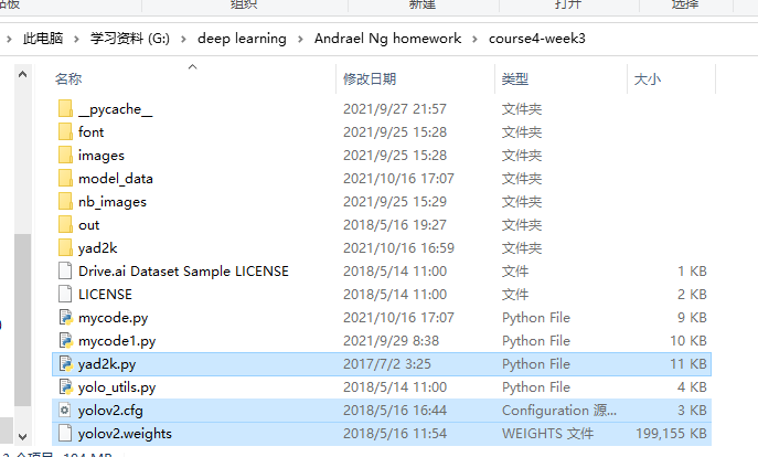 ????????之前下载的作业文件夹model_data里已经有yolov2.cfg和yolov2.weights文件,因此只需将YAD2K的yad2k文件夹替换作业的yad2k文件夹。