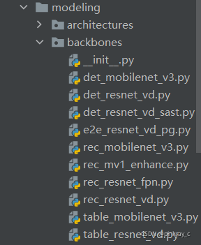 ? ? ? 紧接着是backbones包,构造backbones相关代码。该包是骨干网络代码,主要是PPOCR所选用的骨干网络mobilenet_v3和resnet。包内包含检测mobilenet_v3骨干网络和resnet骨干网络、SAST算法的resnet骨干网络、以及识别mobilenet_v3骨干网络和resnet骨干网络。