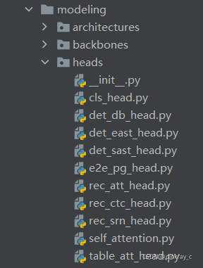 ? ? ? 然后是heads包,构造head相关代码。该包是头函数代码,主要是在保证性能同时减小模型大小所采用的头函数。包含分类头、检测的EAST头、检测的SAST头、检测的DB头、识别的attention头、ctc头以及srn头。