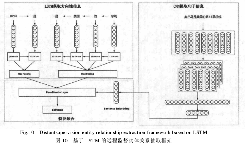c) 特征融合(图 10 左下部分):最后,将 LSTM 隐藏层单元以及 CNN 的非线性单元相融合,通过 Softmax层来标注实体对对应的关系  论文[57]提出的 SE-LSTM 网络结合多示例的方法,其可以在不需要任何 NLP 工具包的帮助下自动地抽取特征,并且通过两个 LSTM 提取实体对的方向性信息.实验表明,该方法大大地提升了关系抽取的准确率.