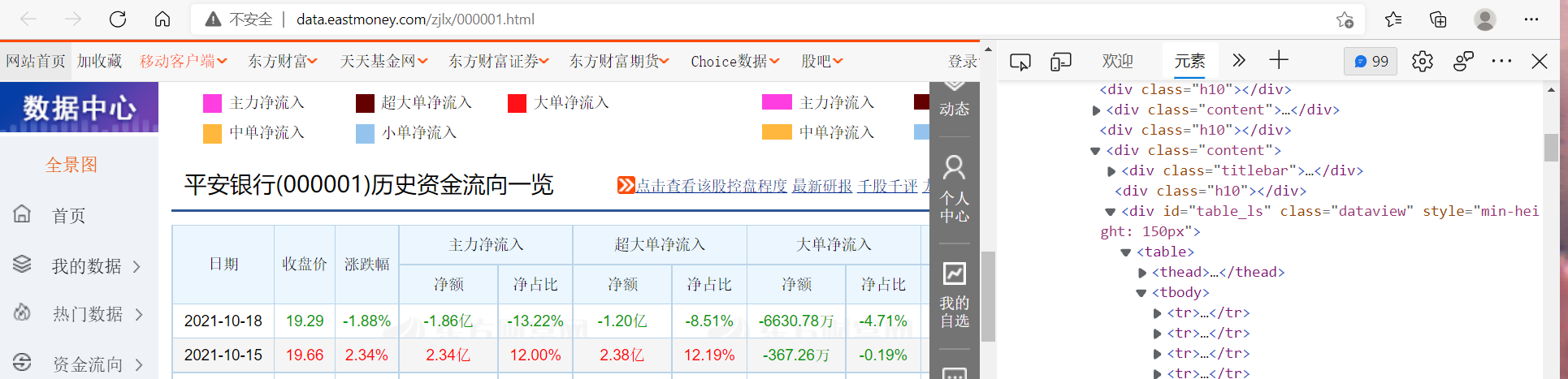 ????????在爬虫前首先打开网页寻找到自己的目标网页。我随便挑选了一个企业,进入其资金流向的界面,检查查看源代码,找到需要提取的表格的区域代码。