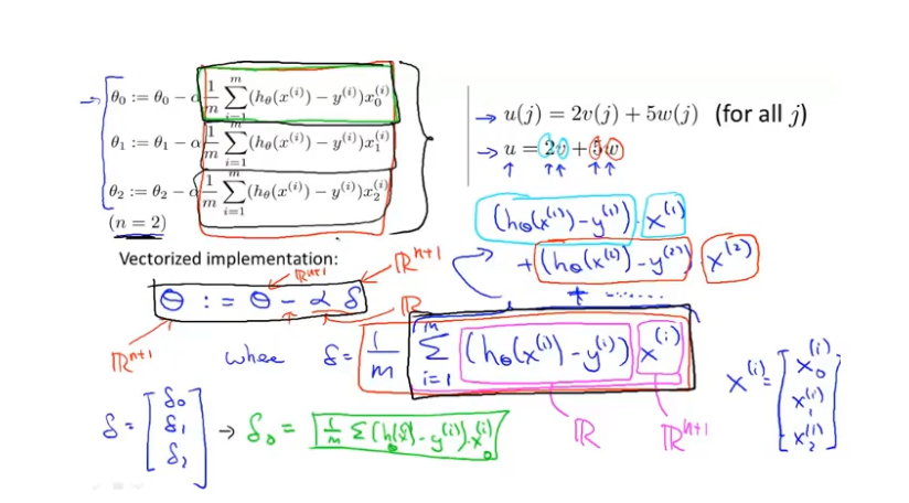 1、在使用线性回归时,如果有十个以上的特征(变量数),建议向量化。这可以减少代码实现相同的功能。 例如:下面这个假设函数用两种方法表示,左边这种是将C塔、xj看作两个数字,应用for循环实现遍历(因为在matlab中下标从1开始,C塔0只能用C塔1表示,所以这里是1到n+1);右边是分别将这些数表示成两个向量时,只要一行代码便能轻松实现。 再举一个例子:线性回归中梯度下降的更新方程。 我们首先展开前面三项,注意:这些式子要实现同步更新,不能异步算值,会影响其他参数。 我们可以分别将左边的C塔0、C塔1、C塔2…组成一个向量C塔(n+1维),右边的阿法是一个实数,剩下的部分也可以组成一个向量。 因为将其展开可以看出相当于一个实数乘以x1、一个实数乘以x2…相当于X向量中的数字变大或变小了,但整体还是可以组成一个向量。