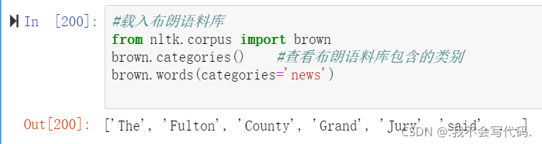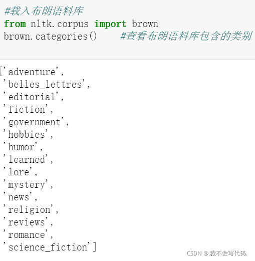 categories()方法可以查看语料库的类别,比如在brown语料库中使用该方法: