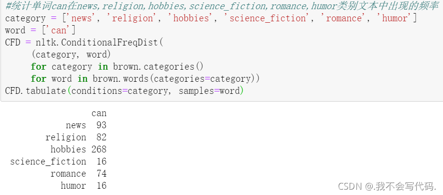 ConditionalFreqDist()函数是一种返回值为条件频率分布的函数,条件频率分布需要处理的是配对列表,每对的形式是(条件,事件),conditions()函数会返回这里的条件。