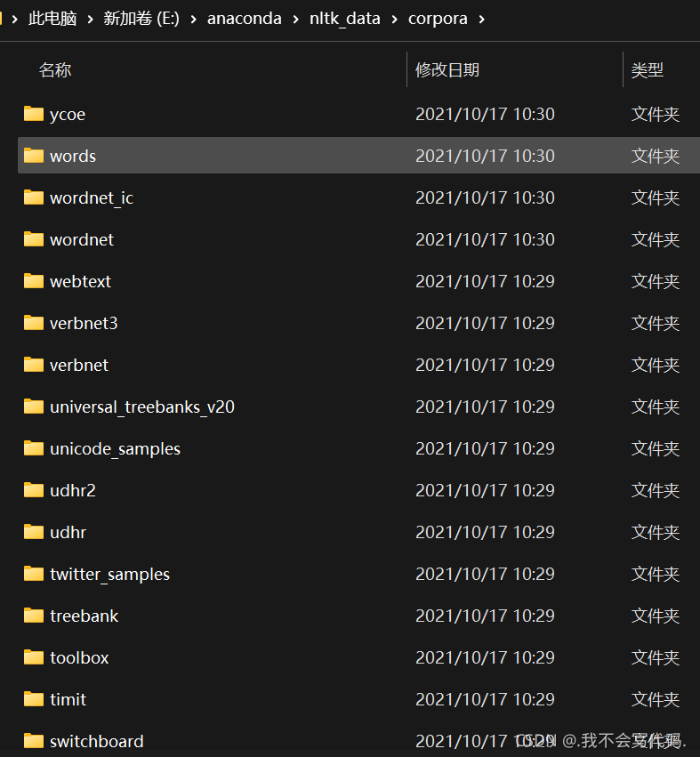 原来是需要将nltk_data下各个目录里的压缩文件解压缩,不然在jupyter上还是不能找到这几个相应的内容包。(下面图片以corpora这个文件夹为例)