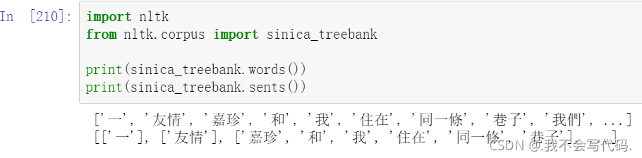 在这个例子当中,我使用的是nltk语料库中自带的sinica_treebank作为中文语料,用words函数获取的结果可以看到,结果是按照一个词一个词来分的,并不能看出句子的区别;但是通过sents函数获取的结果可以发现,不仅是有词的分别,并且能够看到获取的句子的结果,每个句子和句子之间都有明显的分隔的。