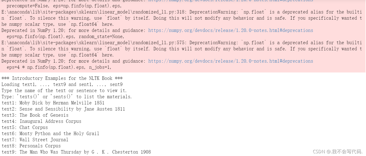 上面的虽然是红色,但是只是warning不是errors,所以只需要看下面的内容,当出现text9这九条数据语料库的时候,说明已经安装成功nltk了。