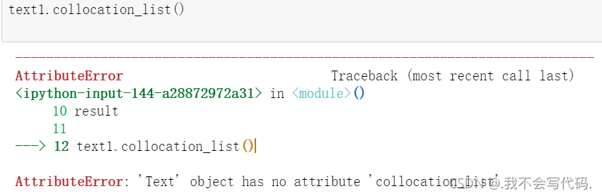 在编写找出文中常用的双联词固定搭配的代码的时候出现了问题。我在使用collocation_list()这个方法的时候会报错 AttributeError: ‘Text’ object has no attribute ‘collocation_list’
