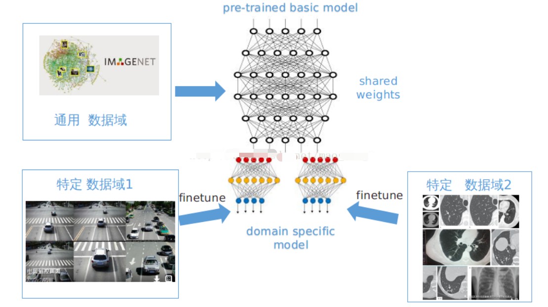这个基础网络是通过含有丰富标签的大规模数据集获得的,比如imagenet,为我们的淘宝电商数据,成为通用的数据域。然后在特定数据域中进行训练。训练时,会固定基础网络部分的参数,对特定领域的网络参数进行训练。这个方法相对较快,依赖数据量也不必太多,效果还行。