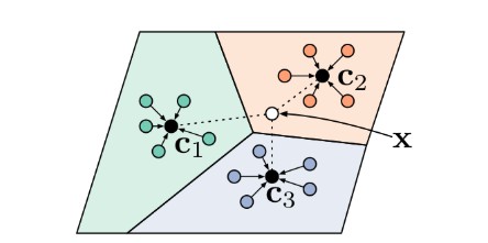 该方法思想十分简单高效,效果也非常好。它学习一个度量空间, 通过计算和每个类别的原型表达的距离来进行分类。文章基于这样的想法:每个类别都存在一个聚在某单个原型表达周围的embedding,该类的原型是support set在embedding空间中的均值。然后,分类问题变成在embedding空间中的最近邻。如图8,c1、c2、c3分别是三个类别的均值中心(称Prototype),将测试样本x进行embedding后,与这3个中心进行距离计算,从而获得x的类别。