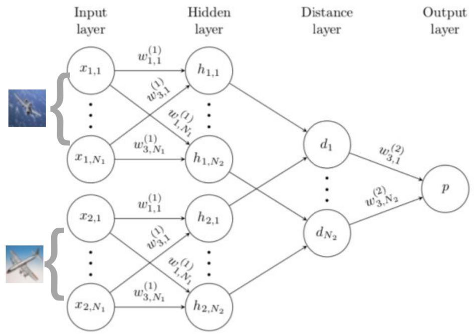 它是一个双路的神经网络。训练时,通过组合不同类的样本成对,同时输入网络进行训练,在最上层通过一个距离的交叉熵进行loss的计算。