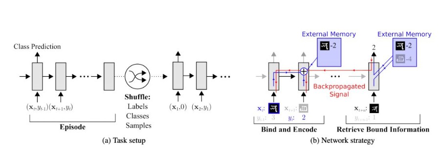 文章基于神经网络图灵机(NTMs)的思想,因为 NTMs 能通过外部存储(external memory)进行短时记忆,并能通过缓慢权值更新来进行长时记忆,NTMs 可以学习将表达存入记忆的策略,并如何用这些表达来进行预测。由此,文章方法可以快速准确地预测那些只出现过一次的数据。
