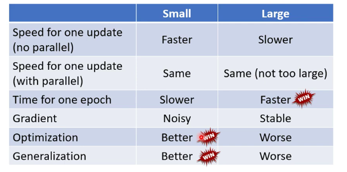 我们在用数据训练神经元的时候,并不是将所有的数据一起运算,分批次运算。比如说我们有2000个样本数据,我们可以将 2000 个样本分成大小为 500 的 batch,此时的batch size为500。我们将看完一次所有数据称为一个epoch(期),看完一期之后,一般会SHUFFLE(重新分批)多次运算。 直观来看,批次尺寸越大时,所需要的时间越多,同时每次用梯度下降更新参数的力度会比较大(其实就是更的值会越大),而小的批次尺寸需要的时间更短,同时数据更新参数会显得波动明显。   但是实际上在有着GPU加速图形运算后,小的batch size在GPU的一定能力内,与大的batch size所花费的时间差距并不大。 图中详细比较了大的batch size 和小的batch size的优劣。  总的来看,越小的batch size在完成一整个epoch(一期)时,速度不占优,但是他在最终的