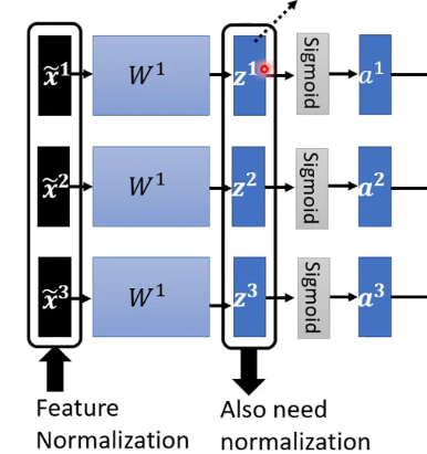 σ代表偏差,当然,这种方法要求批次里面数据的值要大,否则的话太偶然,情况没用。 需要注意的是,在输入的数据标准化之后,经过第一层神经网络之后的输出,我们依然需要进行标准化。  还有需要注意的点就是,在给数据标准化的时候,这一部分已经需要考虑成网络结构的一部分,而不是独立的部分,计算均值和偏差以及之前的部分,构成了一个巨大的神经网络。 我们一般在利用均值方差之后,还会再做一次变换:  很多时候我们不可能等到数据满了一批的尺寸大小时再计算均值偏差,会考虑加上参数p来计算,pytorch种p的值默认为0.1。