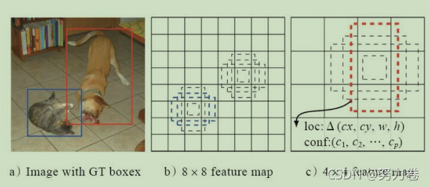 (b)和(c)分别代表不同的特征层,图c相对于图b离最终的预测结果较近,因此其跨越同样像素个数能检测的目标就更大。如b所示,在特征层的每个结点上都将产生4个不同大小的anchor(1:1两个,1:2两个),如c所示,在特征层上也是如此。根据真是目标矩形框与每个anchor的IOU大小计算可知,b中包含2个anchor为正样本,c中只有1个。?