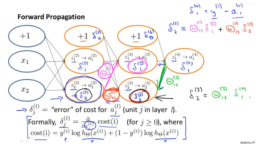 1、举例 例如,我们想用训练的神经网络给图像分类,将自动识别行人、汽车、摩托车、卡车。那么我们的输出层将设置为四种矩阵,分别对应这四种分类结果。相当于四个模拟分类器,只不过结果y(i)不再是简单地对应1,2,3,4,而是四种向量。 2、代价函数 假设当前有这样一个训练集,其中有m组训练样本。设L为这个神经网络的总层数,则L=4;用SL表示第L层的单元数,也就是神经元的数量,其中不包括第L层的偏差单元。 有两种分类,一种是二元分类,一种是多元(K元)分类:如果是二元分类,y=0或1,只有一个输出单元SL=1,神经网络的输出结果h(x)是一个实数; 如果要分成K类(K>=3),那么有K个输出单元SL=K,神经网络的输出结果h(x)是一个K维向量。 现在来设置神经网络的代价函数,上面是逻辑回归的代价函数,神经网络在上面部分修改了一下,即不是只对一个单元y(i),而是对于K个单元y(i),包括正则项。列式如下: 3、反向传播法 为了使代价函数最小,提出了一种反向传播算法(用来求解神经网络中代价函数的导数)。 首先,根据前向传播的过程我们计算每一层的激活值a(i)。将输入向量x看作a(1),计算中间量z(2)=权重向量θ(1)激活值a(1)…然后由此推算a(i)。 接下来,计算每个神经元节点的激活值的误差。 设第l层第j个节点的误差表示为δj(l),那么第四层的误差就是第四层的激活值aj(4)减去训练样本的实际值yj,因为下标j表示的是第j项特征值,那么这个式子完全可以单纯用向量表示; 接下来计算δ(3),注意是向量点乘,右边这个导数g’可以计算出来,用蓝笔写出来了,可以自行推导; 同理可以计算δ(2)。 注意:因为第一层就是输入层,不可能存在误差,所以没有δ(1)。 因此可以算出其偏导项的计算公式(推导过程比较麻烦)如下(暂时忽略正则项,即λ=0): 下面详细描述运用反向传播算法计算代价函数的过程: 先取一条训练数据(x(i),y(i)),利用前向传播计算a(l),再计算最后一层的激活值与实际输出值的误差,然后由此向前推导第L-1层的误差、第L-2层的误差…第2层的误差。最后将这些误差累积,跳出循环时计算Dij(l),就是最终的结果了。 进一步解释 1、根据神经网络的代价函数,假设我们只有一个输出,且不考虑正则项,那么它的代价函数表示如下: 2、那么实际上误差δ等于代价函数的偏导,表示如下;而如何而求上一层的δ要根据下一层的δ乘以权值的累积和计算的,具体过程如下:  细节–将矩阵展开成向量 1、执行代价函数costFunction输入的参数是theta(n+1维的向量),函数返回代价值jVal和导数值gradient(梯度值,是一个n+1维的向量);然后你可以将代数值传递给高级优化算法fminunc,它将取出theta的一些初始值initialTheta(n+1维的向量)。 但是,当我们使用神经网络时,我们的参数就不再是向量,而是矩阵了。因此,在一个L=4层的神经网络中,我们给出参数矩阵θ(1)、θ(2)、θ(3),对应的在octave中表示成Theta1、Theta2、Theta3;计算的梯度矩阵D(1)、D(2)、D(3)(与上面的梯度值gradient对应),对应的在octave中表示成D1、D2、D3。 所以现在就需要学习如何将这些矩阵元素取出并转为向量的小技巧。 2、举例 设输入层有10个单元S1=10,隐藏层有10个单元S2=10,输出层有1个单元S3=1。那么可知参数矩阵θ(1)、θ(2)、θ(3)的维度以及D(1)、D(2)、D(3)的维度,表示如下。 那么首先要将θ(1)、θ(2)、θ(3)中的元素全部取出,然后展开赋给向量thetaVec;将D(1)、D(2)、D(3)中的元素全部取出,然后展开赋给向量DVec。 如果需要将展开的向量复原成矩阵,就使用reshape命令,分别从向量中取出第几个到第几个元素。例如,Theta1是取出第1-110个元素,组成1011的矩阵。