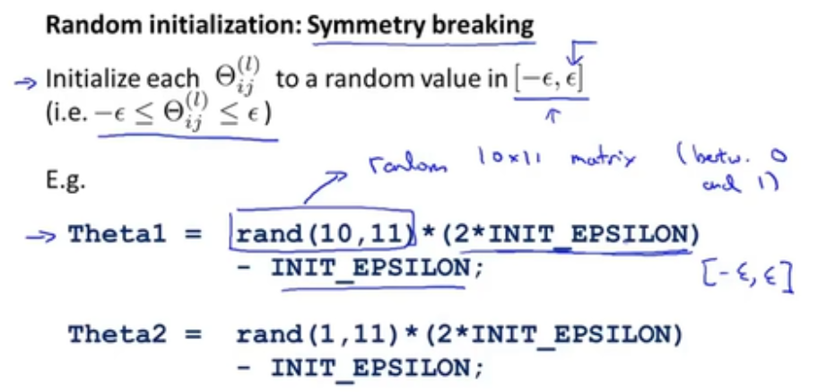 1、由于反向传播的内部实现比较复杂,所以很容易产生一些微秒的bug,看似正常运行,最终结果可能比无bug情况下多出一个量级,但你根本察觉不到。 因此,我们使用梯度检测完成无论是前向传播还是反向传播的检验。 首先,我们来看当θ为实数时这个点的导数表示方式如下,左边是双侧查分,右边是单侧差分,一般我们选择左边这种更为精确。当ε约为10的-4次方的时候,我们认为这个式子约为精确地表示了这个点的导数。 应用到实际代码中是这样的: 梯度检测方案: 现在我们考虑当θ是一个n维向量时,我们用类似的思想计算所有的偏导项: 为了实现上述流程,我们使用如下代码: 这里的n指的是参数向量θ的维数,这样可以近似地求出这一点的导数项。接下来我们将使用反向传播算法计算出的导数DVec与刚刚算出的导数值gradApprox比较,在无bug的情况下二者应该是约等于(只有几位小数的差距)的关系。 至此,梯度检测介绍完毕。 2、接下来介绍应用顺序建议 第一步,应用反向传播算法计算DVec;第二步,应用梯度检测计算gradApprox;第三步,确保二者的值近似相等;第四步,关掉梯度检测,将反向传播代码用于学习。(因为梯度检测算法的计算效率远远低于反向传播算法计算DVec的效率,所以检测完后请务必关闭) 细节–随机初始化 1、当我们在执行一个梯度下降算法或其他高级算法时,我们需要为变量θ选择一个初始值initialTheta,在逻辑回归中我们一般将之设为0。 但实际在神经网络中将所有权重初始化为0是不对的,这样会导致所有层的激活值一样、误差一样, 在后续的梯度更新中,蓝色线与蓝色线、红色线与红色线…代表的权重同时改变并且同时相等,这将形成一个高度冗余的现象。 2、随机初始化方案 我们刚刚遇到的问题又被称为对称权重问题,需要用随机初始化解决。我们对每一个参数权重θ初始化到一个范围为[-ε,ε]的随机值。 例如我们将Theta1初始化:用一个10*11的随机矩阵rand(10,11)介于0-1之间,然后乘以两倍的ε,减去一个ε,最后得到一个[-ε,ε]的值。 注意,这里的ε与梯度检验中的ε没有关联。