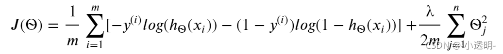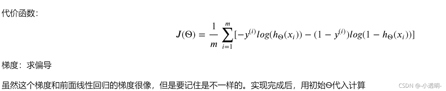 ?在原来的基础上加上正则项(缩小每一个?) 记住?0是不需要正则化的,下标从1开始。 梯度的第j个元素的更新公式为:对上面的算法中 j=1,2,...,n 时的更新式子进行调整可得:把初始(所有元素为0)带入,代价应为0.693这一部分要实现计算逻辑回归的代价函数和梯度的函数。代价函数公式如下: