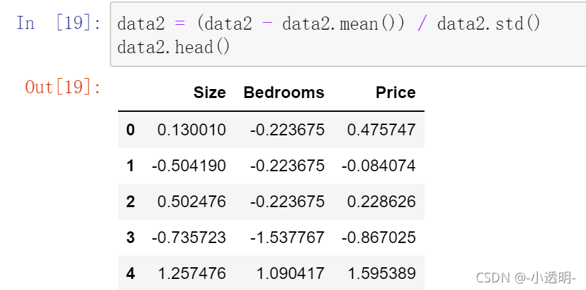 观察数据发现,size变量是bedrooms变量的1000倍大小,统一量级会让梯度下降收敛的更快。做法就是,将每类特征减去他的平均值后除以标准差。