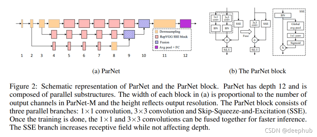 ParNet 的一个关键组件是它的 RepVGG-SSE,这是一个经过修改的 Rep-VGG 块,并带有一个专门构建的 Skip-Squeeze-Excitation 模块。 ParNet 还包含一个降低分辨率并增加宽度以实现多尺度处理的下采样块,以及一个融合多个分辨率信息的融合块。