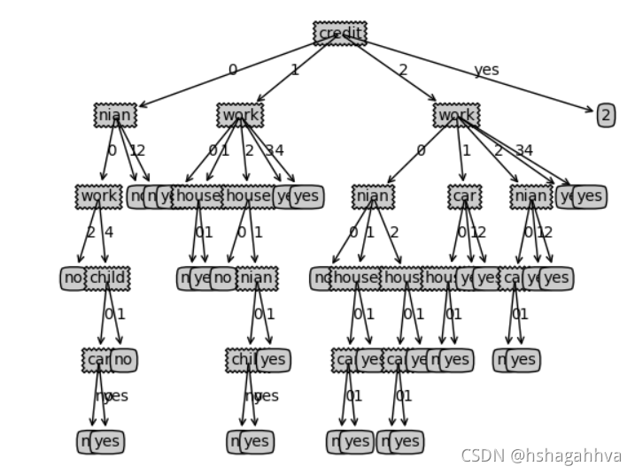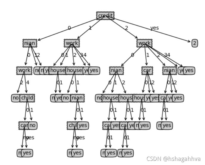 ? ? ? ? 下面数据属性有6个,分别为yea,0,1,2分别表示老年,中年,青年;work,0,1,2,3,4,5分别表示工资1000以下,1000到3000,3000到5000,5000到8000,8000到10000,10000以上;house,0, 1分别表示有房子和无房子;car, 0,1 ,2分别表示无车,一般车,好车;child,0,1?分别表示有孩子,无孩子;credit,0,1,2分别表示信用差,信用一般,信用好。最终判断是否给这个人贷款。