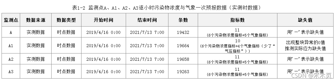从附件名字可以推测数据集的内部结构应该基本一致,只是监测点不同而已,事实也是如此。以监测点A为例,表1-1展示了监测点A提供的三份数据。