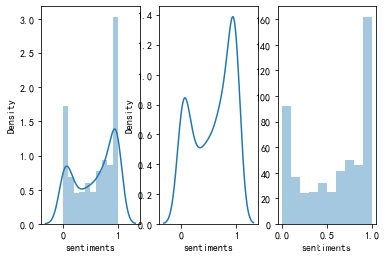 ????????将数据进一步可视化绘制密度图与直方图可看出,用户情感集中分布在0-0.1和0.9-1,这也与Star评星维度相匹配: