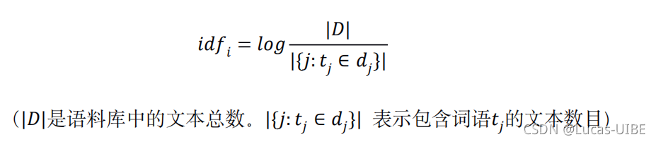 ?(3)IDF((inverse document frequency),逆文档频率,他衡量某个单词在所有文档集合中的常见程度。当包含某个字的文档的篇数越多时,该词所含特异性信息越少,重要性越低,计算公式为: