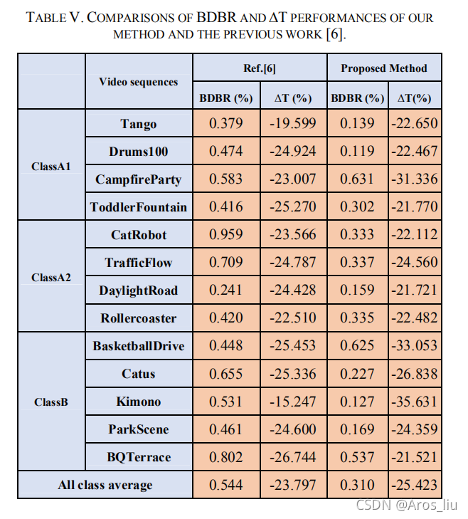 实验还是在ClassA1、ClassA2、ClassB、ClassC和ClassE序列上进行实验,实验结果如表5所示。可以看出在高分辨率上效果较好,在低分辨率上效果较差。低分辨率上能参考的LCU信息比较少。总体上提出的方法可以在AI配置下表加速25.423%的同时BDBR增加0.31%。