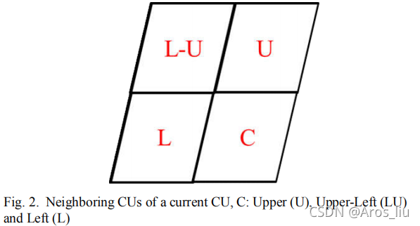 LCU一般都会被QT划分,当CU尺寸达到32x32到8x8时,会开始允许BT划分,但跟上一代标准HEVC相比,QTBT划分决策花费的时间是HEVC的5~6倍。根据文献[9],相邻的块可以分为左上(LU)的CU,左边(L)的CU和上方(U)的CU,如图2所示。这里没包括右上的CU,如果包括的话最右边一列的CU就没办法被加速了,这样的话对整张图片来说减小了加速性能。由于LCU尺寸是128x128,比较大,LCU之间的相关性很难预测,所以每个相邻LCU分配的权重是相同的。