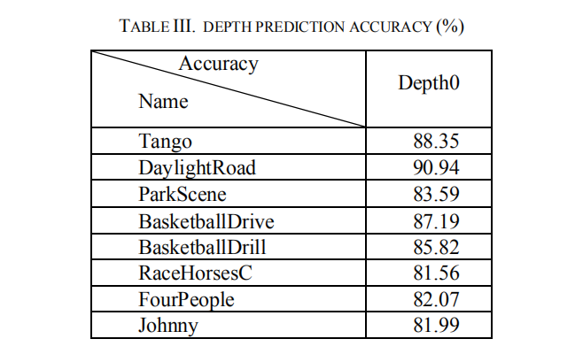 寻找BT深度的统计规律,即统计一个LCU的最优QT深度分别为2/3/4时BT的最优深度情况与邻近平均BT深度之间的关系。最后得出的BT加速方案是:当一个BT深度为0的CU,其邻近LCU的平均BT深度低于0.1时,当前CU很有可能最终的最优BT深度为0。表3统计了这样做的准确度,可以看出80%以上CU都满足这个规律。