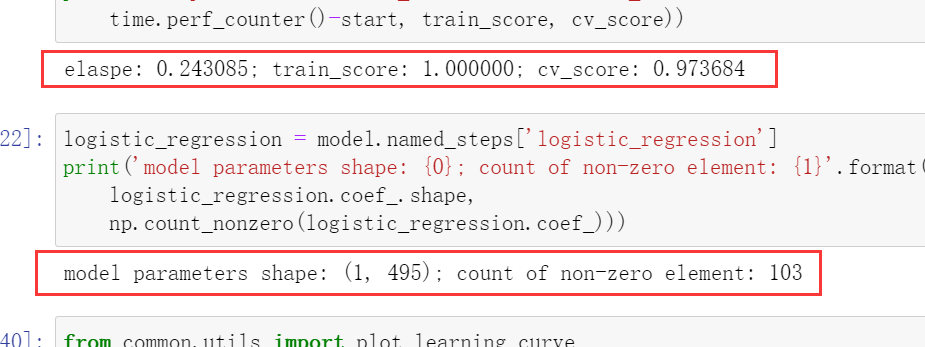 print('elaspe: {0:.6f}; train_score: {1:0.6f}; cv_score: {2:.6f}'.format(