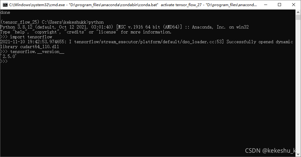 conda create -n tensor_flow_25 python=3.8#这里指定python的版本为3.8 (>=3.6)