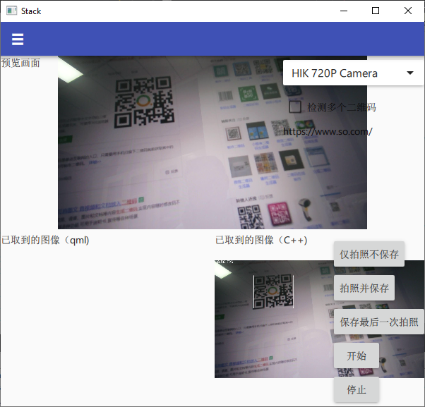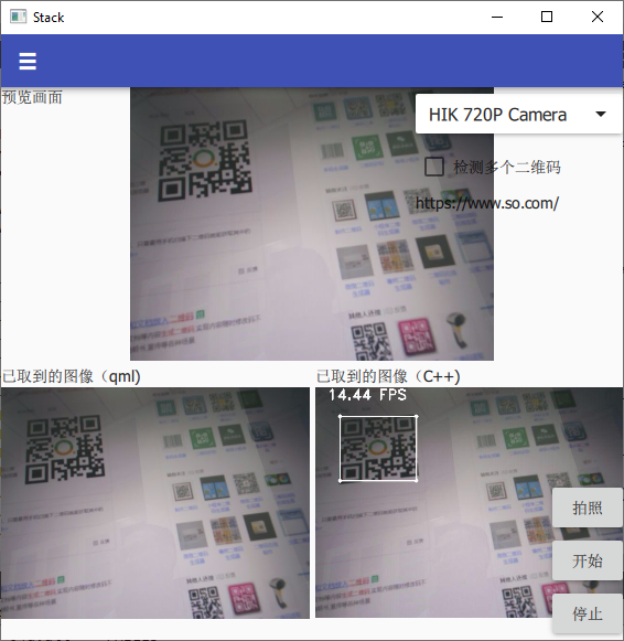 说明: 1.在程序运行时,主线程调用setImage()函数,不停注入新的图像,但处理类只保留最后一张图像 2.process()运行在新开的线程中,被定时触发,若有图像未处理,就处理掉 有关解码处理函数的具体实现方法,修改自openCV官方示例,在此就不再解释 3.微信解码器初始化时,需要载入4个模型相关的文件,笔者为方便大家学习,已经直接放入Qt资源文件中,在处理类初始化时,会复制到临时文件中。 4.关于微信扫码的结果,返回的点放入std::vector<cv::Mat>中。 每个二维码的四个点对应一个cv::Mat 每个cv::Mat是一个4行2列的float矩阵,每行存放x、y坐标,均点4个字节 修改完成以上代码,就可以运行程序了,以下是笔者的运行结果 1.Qt6.2.1在win10下的运行结果