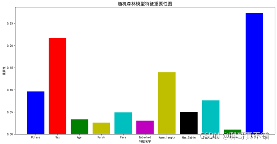 通过上图可以看出,随机森林模型特征重要性排名为Title、Sex等。