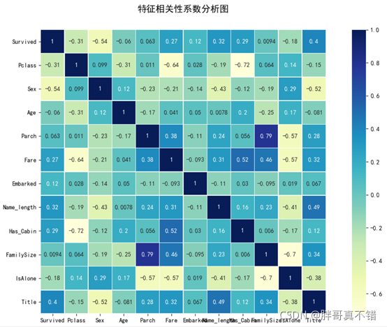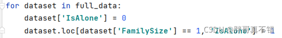 通过SibSp 和 Parch 特征的结合,来构建新的特征FamilySize;通过FamilySize特征来构建IsAlone特征;关键代码如下: