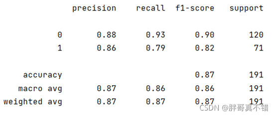 从上图可以看到,分类类型为0的F1分值为0.90;分类类型为1的F1分值为0.82;整个模型的准确率为0.87.