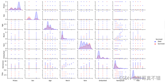 这种配对图,可以看到每两个特征之间 针对乘客是否生存形成对比,方便观察特征。例如:乘客在2等舱且年龄越小 越容易生存。