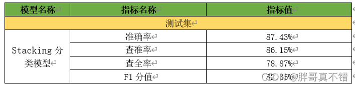 ?从上表可以看出,准确率为87% ?F1分值为82%,Stacking分类模型也相当不错。