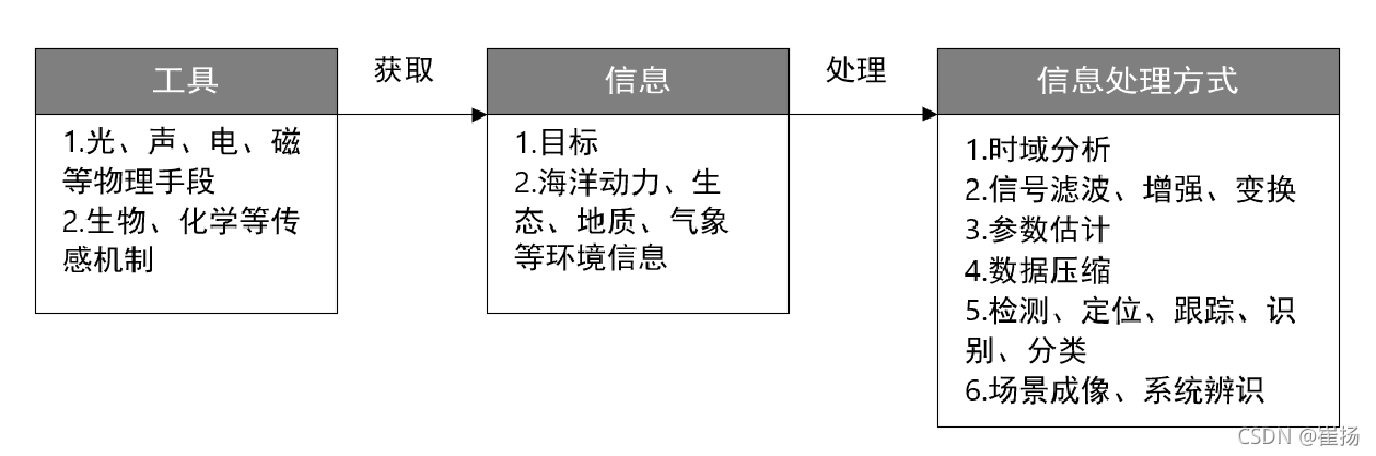 前言刚刚也提到水下目标探测面临两个1000倍的难题,海洋信息处理由于水下的复杂性也存在着很多的突破方向。下图给出海洋信息传输的大致过程  海洋信息传输一般将其分为无线电通信和水声通信,二者的区别是一个以电磁波为载体,一个以声波为载体,二者的主要优缺点如下: