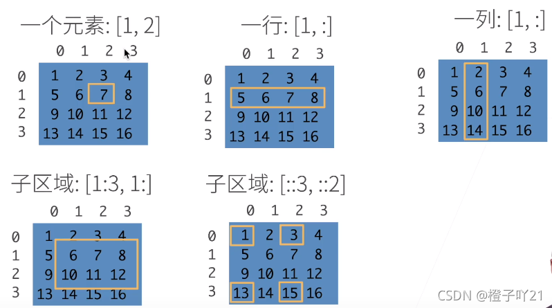 子区域:[::3,::2]双冒号是跳着访问,每三行一跳。每两列一跳。
