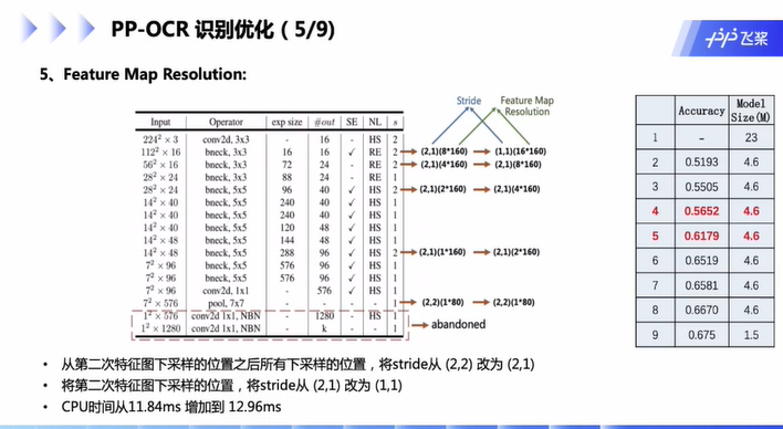 ? ? ? ? 当然,调整特征图分辨率也有缺点,因为分辨率大的话对识别时间增加 因为PP-OCR所选用的模型比较小,所以对实现图像识别的速率影响并不会非常明显。如实验显示,对单张图像的识别时间从11.84ms增加到12.96ms。