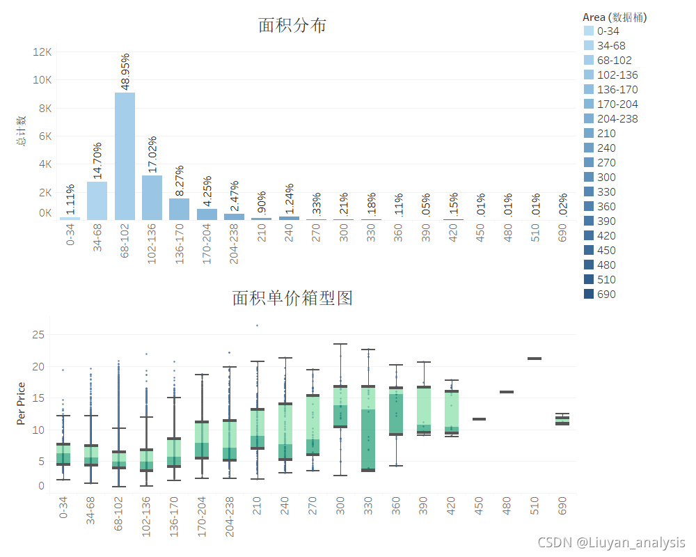2.面积变化,单价波动明显,说明面积对单价有一定影响。