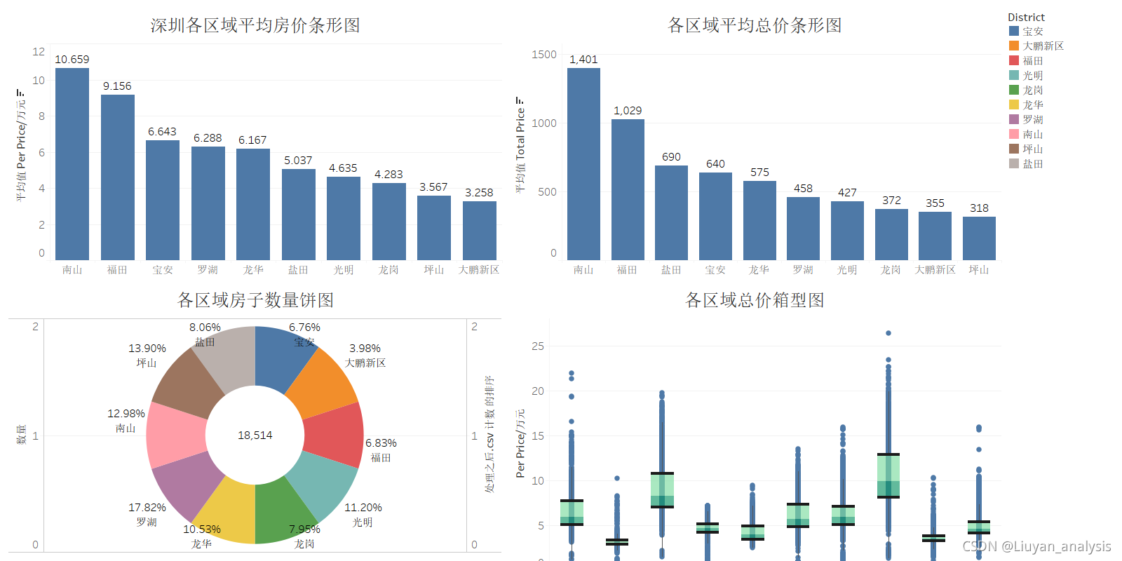 - 南山区二点平均房价最高,大鹏新区最低。