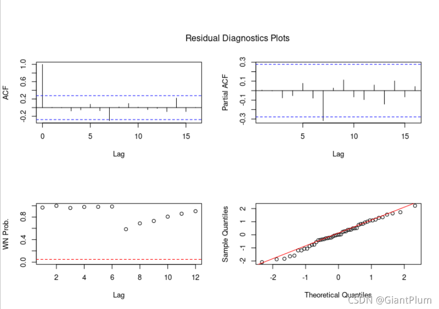 ?由残差的ACF、PACF、QQ和白噪声概率图可知残差已为白噪声,故认为AR(1)模型是该序列的有效拟合模型。