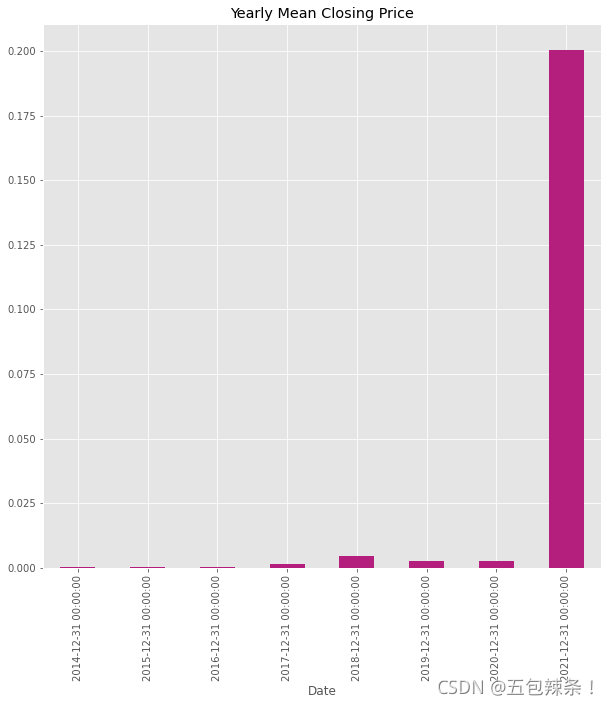 Date | | | | | | | | | 2014-12-31 | 0.000249 | 0.000259 | 0.000240 | 0.000248 | 0.000248 | 8.059213e+05 | 8.059213e+05 | 1.028630 | 2015-12-31 | 0.000143 | 0.000147 | 0.000139 | 0.000143 | 0.000143 | 1.685476e+05 | 1.685476e+05 | 0.139461 | 2016-12-31 | 0.000235 | 0.000242 | 0.000229 | 0.000235 | 0.000235 | 2.564834e+05 | 2.564834e+05 | 0.259038 | 2017-12-31 | 0.001576 | 0.001708 | 0.001468 | 0.001601 | 0.001601 | 1.118996e+07 | 1.118996e+07 | 0.225833 | 2018-12-31 | 0.004368 | 0.004577 | 0.004125 | 0.004350 | 0.004350 | 2.172325e+07 | 2.172325e+07 | 0.109586 | 2019-12-31 | 0.002564 | 0.002631 | 0.002499 | 0.002563 | 0.002563 | 4.463969e+07 | 4.463969e+07 | 0.027981 | 2020-12-31 | 0.002736 | 0.002822 | 0.002660 | 0.002744 | 0.002744 | 1.290465e+08 | 1.290465e+08 | 0.052314 | 2021-12-31 | 0.200410 | 0.215775 | 0.185770 | 0.201272 | 0.201272 | 4.620961e+09 | 4.620961e+09 | 0.260782 |