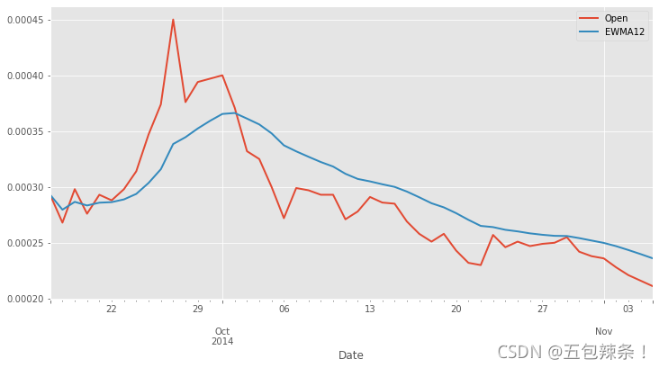 df['EWMA12'] = df['Open'].ewm(span=14,adjust=True).mean()