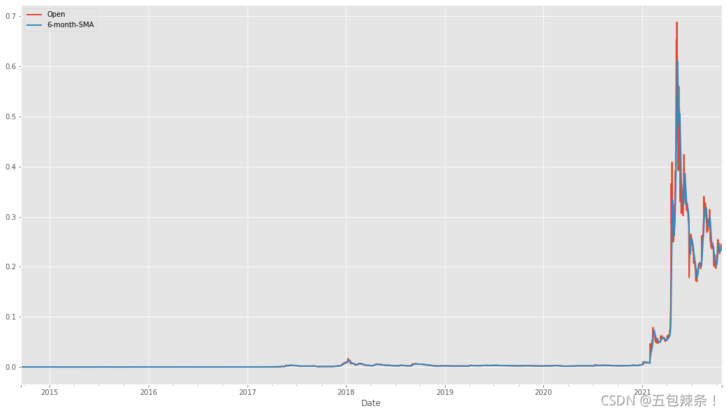 df[["Open","6-month-SMA"]].plot(figsize=(18,10))