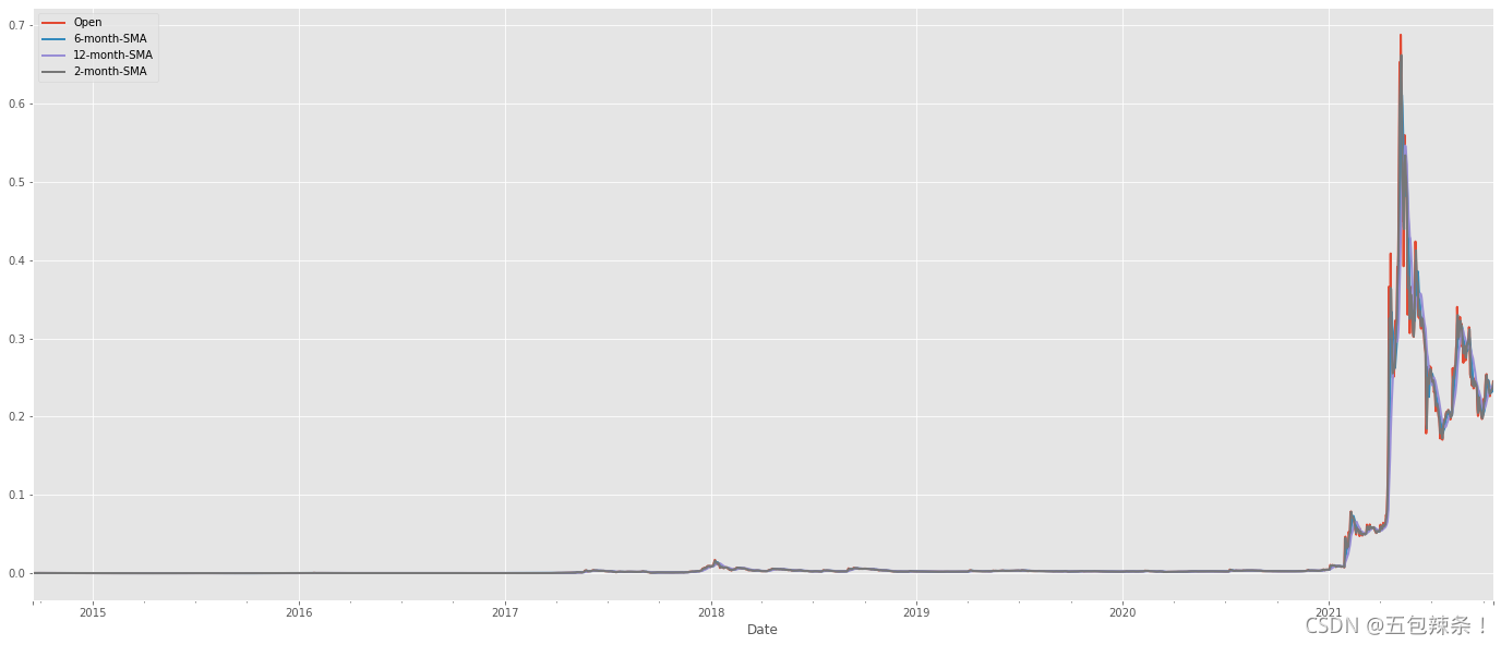 df[['Open', '6-month-SMA', '12-month-SMA', '2-month-SMA']].plot(figsize=(24, 10))