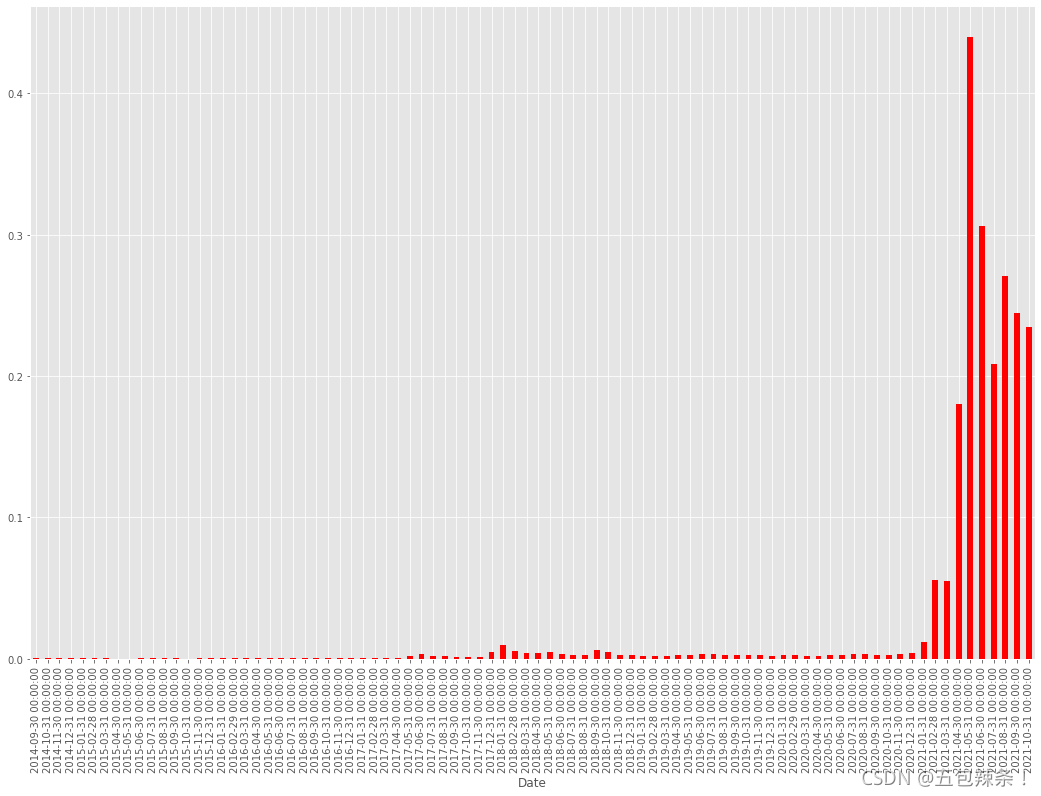 df['Open'].resample('M').mean().plot.bar(figsize=(18, 12), color='red')